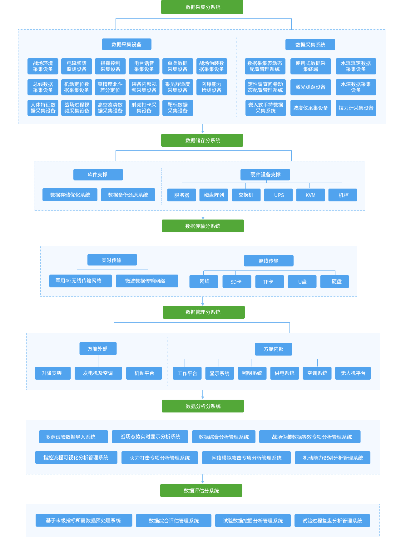 數(shù)據(jù)采集分系統(tǒng)主要包含自動(dòng)化數(shù)據(jù)采集設(shè)備部分和手動(dòng)數(shù)據(jù)采集部分。自動(dòng)化數(shù)據(jù)采集設(shè)備主要有戰(zhàn)場(chǎng)環(huán)境數(shù)據(jù)采集設(shè)備、電磁頻譜監(jiān)測(cè)設(shè)備、指揮控制數(shù)據(jù)采集設(shè)備、電臺(tái)話音數(shù)據(jù)采集設(shè)備、單兵數(shù)據(jù)采集設(shè)備、總線數(shù)據(jù)采集設(shè)備等;手動(dòng)數(shù)據(jù)采集部分主要有數(shù)據(jù)采集表動(dòng)態(tài)配置管理系統(tǒng)、定性調(diào)查問(wèn)卷動(dòng)態(tài)配置管理系統(tǒng)、嵌入式手持?jǐn)?shù)據(jù)采集系統(tǒng)、便攜式數(shù)據(jù)采集終端、激光測(cè)距設(shè)備、水深數(shù)據(jù)采集設(shè)備等。能夠滿足裝備試驗(yàn)過(guò)程中多源試驗(yàn)數(shù)據(jù)的分類、分組精細(xì)化采集存儲(chǔ)。